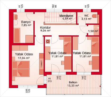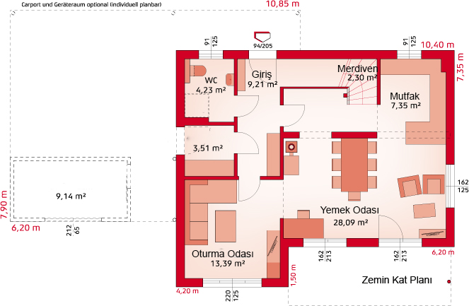 ÇATI FORMU VE YÜZEY 22 ° açık çatı 92.04 m2 inşaat alanı 68.08 m2 zemin kat 66.77 m2 birinci kat 134.85 m2 net taban alanı